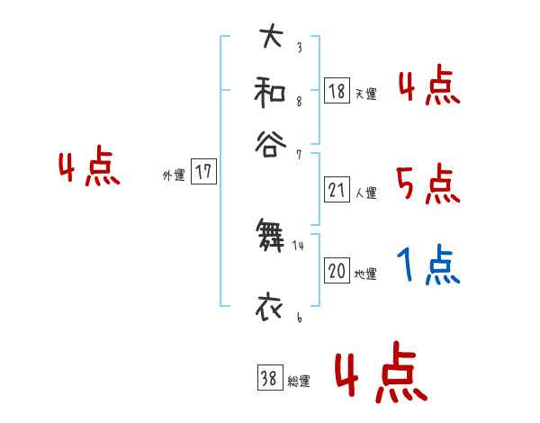 天運![]() | 大和谷舞衣さんの天運は18画の4つ星!情熱的で剛気。忍耐力があり信頼される。 家系が持つ宿命的な運勢を表します。祖先から受け継いだ苗字ですので自分の力が及びません。家柄を象徴します。 |