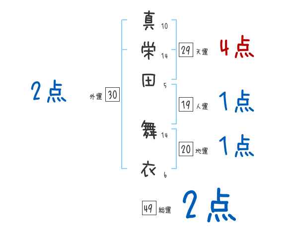 天運![]() | 真栄田舞衣さんの天運は29画の4つ星!完全主義で才能がある。厳格な心の持ち主。 家系が持つ宿命的な運勢を表します。祖先から受け継いだ苗字ですので自分の力が及びません。家柄を象徴します。 |