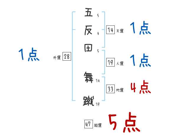 天運![]() | 五反田舞蹴さんの天運は14画の1つ星!人に対して優しいがストレスを溜め込みがち。人間関係のトラブルを避けるよう気をつけましょう。 家系が持つ宿命的な運勢を表します。祖先から受け継いだ苗字ですので自分の力が及びません。家柄を象徴します。 |