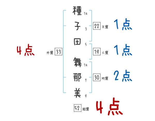 外運![]() | 種子田舞那美さんの外運は33画の4つ星!権力志向でプライドが高い。勇気があり運を切り開き成功する。 生活面を象徴する運勢です。外部から受ける影響力を表し、結婚運、家庭運や職場、環境への順応性を表します。 |