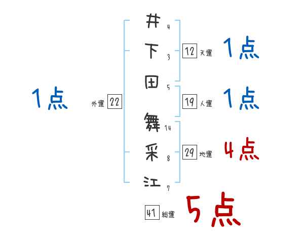 地運![]() | 井下田舞采江さんの地運は29画の4つ星!完全主義で才能がある。厳格な心の持ち主。 個性を表す基礎的な運勢です。性格形成や対人関係、行動力など家庭環境に影響されます。主に誕生してから20歳くらいまでの若年期の運勢を表します。 |