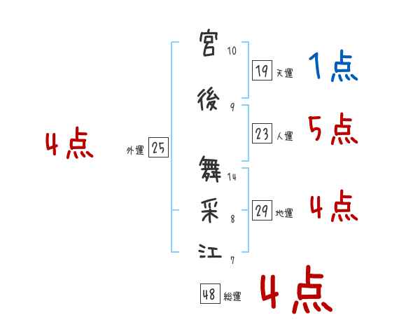 人運![]() | 宮後舞采江さんの人運は23画の5つ星!想像力に優れ活力がある。一代で成功し名誉を手に入れる。 性格や才能などを表す2番目に重要な運勢です。人間関係や協調性、社会的な成功に影響します。主に20歳から50歳ぐらいまでの中年期の運勢を表します。 |