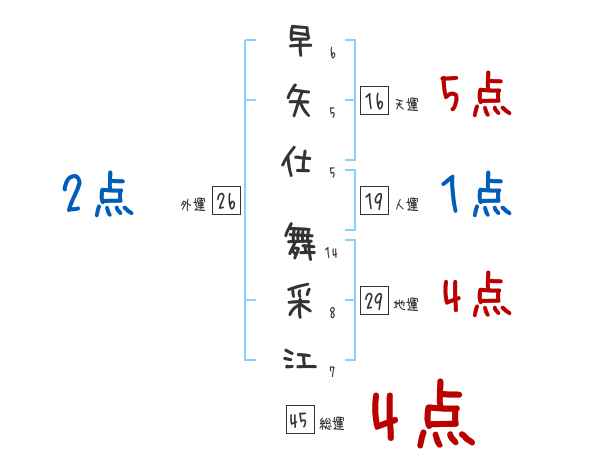 外運![]() | 早矢仕舞采江さんの外運は26画の2つ星!波瀾万丈かも。信頼できる人を大事にしましょう。 生活面を象徴する運勢です。外部から受ける影響力を表し、結婚運、家庭運や職場、環境への順応性を表します。 |