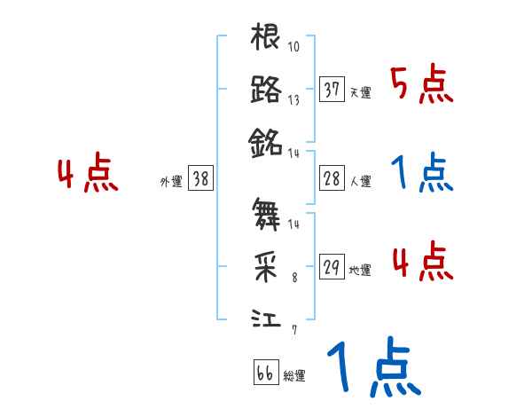 外運![]() | 根路銘舞采江さんの外運は38画の4つ星!温厚な性格で技術的な才能を発揮する。職人的な仕事に向いている。 生活面を象徴する運勢です。外部から受ける影響力を表し、結婚運、家庭運や職場、環境への順応性を表します。 |