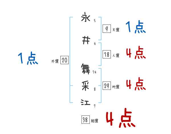 天運![]() | 永井舞采江さんの天運は9画の1つ星!消極的で才能を発揮することが苦手なことも。周りの意見に耳を傾けましょう。 家系が持つ宿命的な運勢を表します。祖先から受け継いだ苗字ですので自分の力が及びません。家柄を象徴します。 |