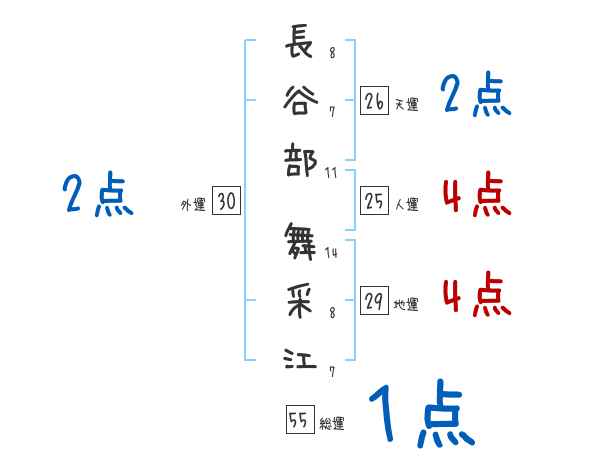 外運![]() | 長谷部舞采江さんの外運は30画の2つ星!浮き沈みの激しさに注意しましょう。 生活面を象徴する運勢です。外部から受ける影響力を表し、結婚運、家庭運や職場、環境への順応性を表します。 |