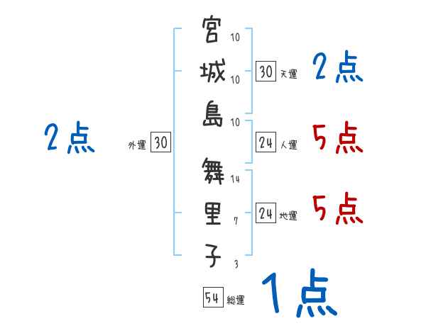 天運![]() | 宮城島舞里子さんの天運は30画の2つ星!浮き沈みの激しさに注意しましょう。 家系が持つ宿命的な運勢を表します。祖先から受け継いだ苗字ですので自分の力が及びません。家柄を象徴します。 |