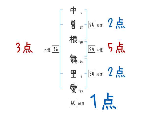 外運![]() | 中曽根舞里愛さんの外運は36画の3つ星!先見性が豊かです。多少神経質で苦労することも。 生活面を象徴する運勢です。外部から受ける影響力を表し、結婚運、家庭運や職場、環境への順応性を表します。 |