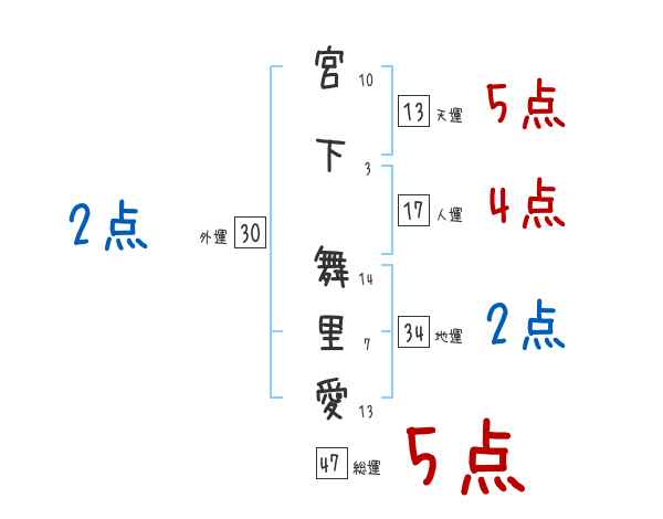 総運![]() | 宮下舞里愛さんの総運は47画の5つ星!実力が開花し発展する円満な人生。財に恵まれる。 あなたの人生を表す1番重要な運勢です。生涯を通じて影響する総合運となり、主に50歳以降の晩年期に影響を及ぼします。 |