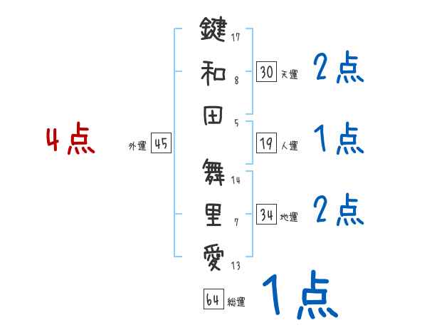 天運![]() | 鍵和田舞里愛さんの天運は30画の2つ星!浮き沈みの激しさに注意しましょう。 家系が持つ宿命的な運勢を表します。祖先から受け継いだ苗字ですので自分の力が及びません。家柄を象徴します。 |