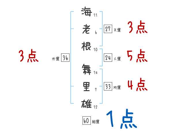 外運![]() | 海老根舞里雄さんの外運は36画の3つ星!先見性が豊かです。多少神経質で苦労することも。 生活面を象徴する運勢です。外部から受ける影響力を表し、結婚運、家庭運や職場、環境への順応性を表します。 |