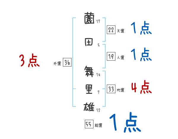 外運![]() | 薗田舞里雄さんの外運は36画の3つ星!先見性が豊かです。多少神経質で苦労することも。 生活面を象徴する運勢です。外部から受ける影響力を表し、結婚運、家庭運や職場、環境への順応性を表します。 |