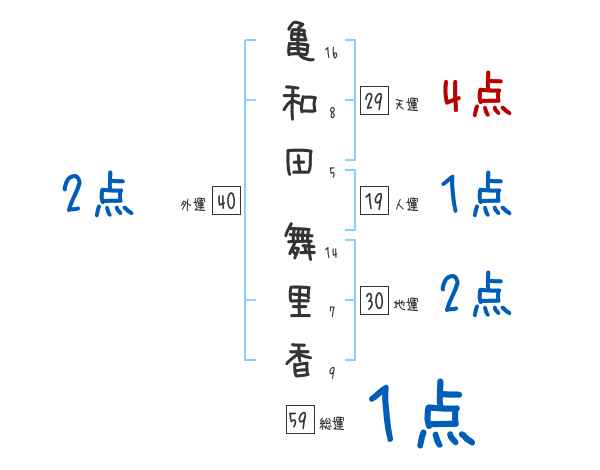 天運![]() | 亀和田舞里香さんの天運は29画の4つ星!完全主義で才能がある。厳格な心の持ち主。 家系が持つ宿命的な運勢を表します。祖先から受け継いだ苗字ですので自分の力が及びません。家柄を象徴します。 |