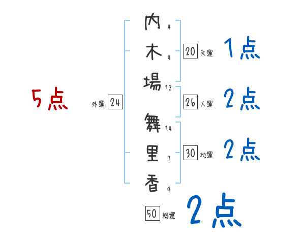 外運![]() | 内木場舞里香さんの外運は24画の5つ星!家庭運が良く順調な人生。金運にも恵まれる。 生活面を象徴する運勢です。外部から受ける影響力を表し、結婚運、家庭運や職場、環境への順応性を表します。 |