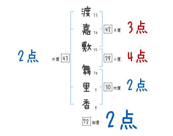 総運![]() | 渡嘉敷舞里香さんの総運は72画の2つ星!災難が多く不安定な生活にならないように注意。明暗のある人生かも。 あなたの人生を表す1番重要な運勢です。生涯を通じて影響する総合運となり、主に50歳以降の晩年期に影響を及ぼします。 |