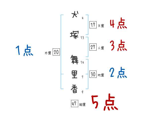 | 天運  | 犬塚舞里香さんの天運は17画の4つ星!積極的な行動力。地位を気づき財産を手に入れる。純粋な心と直感力。家系が持つ宿命的な運勢を表します。祖先から受け継いだ苗字ですので自分の力が及びません。家柄を象徴します。 |