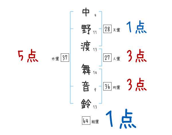 天運![]() | 中野渡舞音鈴さんの天運は28画の1つ星!家庭環境に注意。スポーツで活躍できる能力があるかも。 家系が持つ宿命的な運勢を表します。祖先から受け継いだ苗字ですので自分の力が及びません。家柄を象徴します。 |