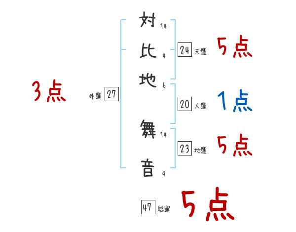 外運![]() | 対比地舞音さんの外運は27画の3つ星!頭脳明晰だが強情で摩擦が多い傾向。孤立に注意。 生活面を象徴する運勢です。外部から受ける影響力を表し、結婚運、家庭運や職場、環境への順応性を表します。 |