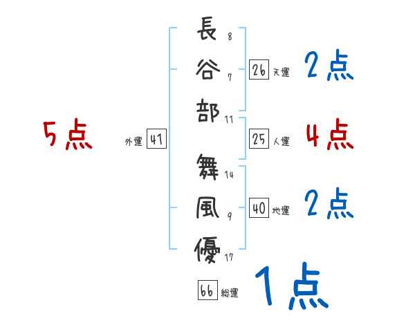 総運![]() | 長谷部舞風優さんの総運は66画の1つ星!迷うことが多く挫折しやすい傾向が。辛抱強く物事に取り組みましょう。 あなたの人生を表す1番重要な運勢です。生涯を通じて影響する総合運となり、主に50歳以降の晩年期に影響を及ぼします。 |