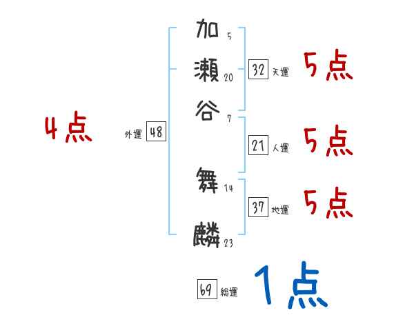 天運![]() | 加瀬谷舞麟さんの天運は32画の5つ星!柔軟性があり成功する。チャンスが多く金運が良い。 家系が持つ宿命的な運勢を表します。祖先から受け継いだ苗字ですので自分の力が及びません。家柄を象徴します。 |