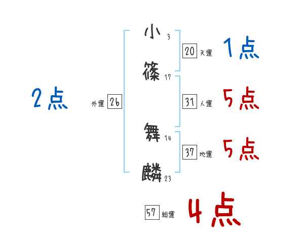 外運![]() | 小篠舞麟さんの外運は26画の2つ星!波瀾万丈かも。信頼できる人を大事にしましょう。 生活面を象徴する運勢です。外部から受ける影響力を表し、結婚運、家庭運や職場、環境への順応性を表します。 |