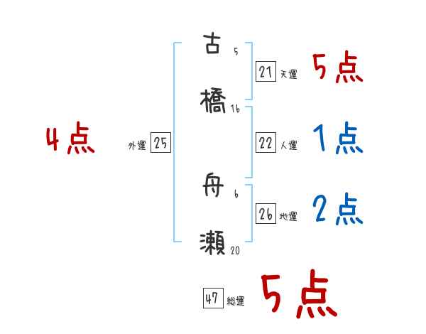 天運![]() | 古橋舟瀬さんの天運は21画の5つ星!統率力がある。独立し成功する。名誉を手に入れる。 家系が持つ宿命的な運勢を表します。祖先から受け継いだ苗字ですので自分の力が及びません。家柄を象徴します。 |