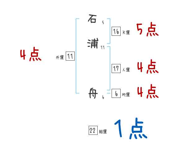 天運![]() | 石浦舟さんの天運は16画の5つ星!人望が厚く大きく発展する。逆転成功が見える。 家系が持つ宿命的な運勢を表します。祖先から受け継いだ苗字ですので自分の力が及びません。家柄を象徴します。 |