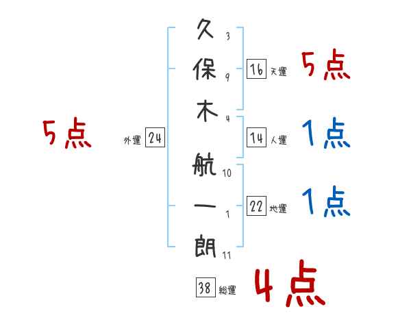 天運![]() | 久保木航一朗さんの天運は16画の5つ星!人望が厚く大きく発展する。逆転成功が見える。 家系が持つ宿命的な運勢を表します。祖先から受け継いだ苗字ですので自分の力が及びません。家柄を象徴します。 |