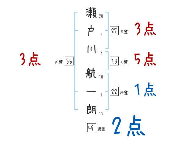 天運![]() | 瀬戸川航一朗さんの天運は27画の3つ星!頭脳明晰だが強情で摩擦が多い傾向。孤立に注意。 家系が持つ宿命的な運勢を表します。祖先から受け継いだ苗字ですので自分の力が及びません。家柄を象徴します。 |