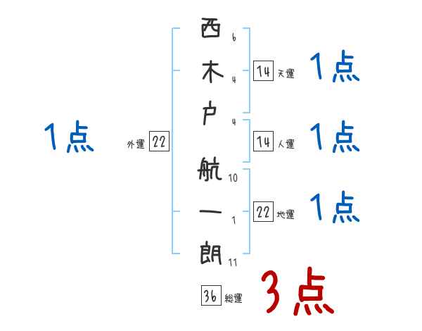 総運![]() | 西木戸航一朗さんの総運は36画の3つ星!先見性が豊かです。多少神経質で苦労することも。 あなたの人生を表す1番重要な運勢です。生涯を通じて影響する総合運となり、主に50歳以降の晩年期に影響を及ぼします。 |