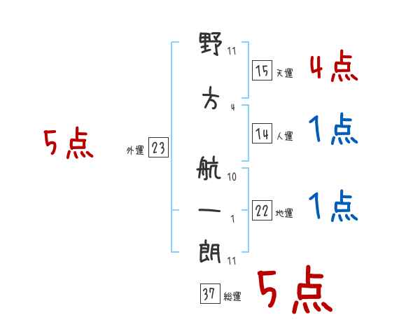 総運![]() | 野方航一朗さんの総運は37画の5つ星!努力家で順応性に優れる。現実的な考え方ができ忠実に物事をこなす。 あなたの人生を表す1番重要な運勢です。生涯を通じて影響する総合運となり、主に50歳以降の晩年期に影響を及ぼします。 |