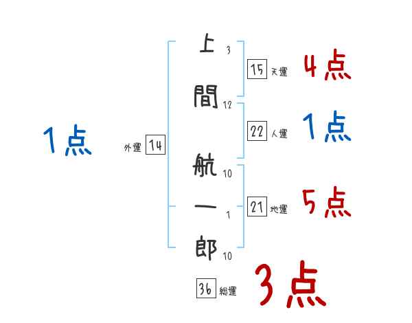 外運![]() | 上間航一郎さんの外運は14画の1つ星!人に対して優しいがストレスを溜め込みがち。人間関係のトラブルを避けるよう気をつけましょう。 生活面を象徴する運勢です。外部から受ける影響力を表し、結婚運、家庭運や職場、環境への順応性を表します。 |