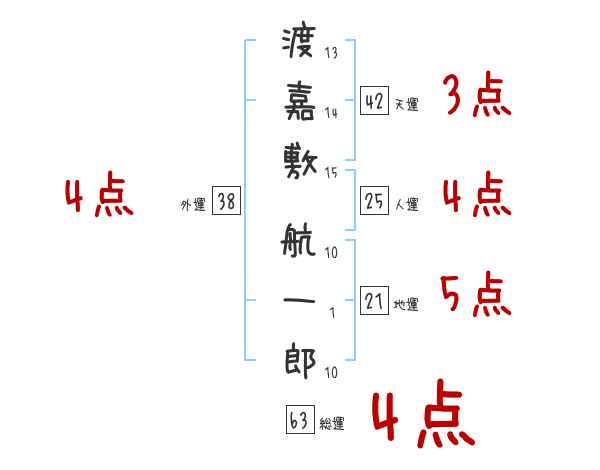 天運![]() | 渡嘉敷航一郎さんの天運は42画の3つ星!病気に注意。多芸であるが消極的でおとなしい。 家系が持つ宿命的な運勢を表します。祖先から受け継いだ苗字ですので自分の力が及びません。家柄を象徴します。 |