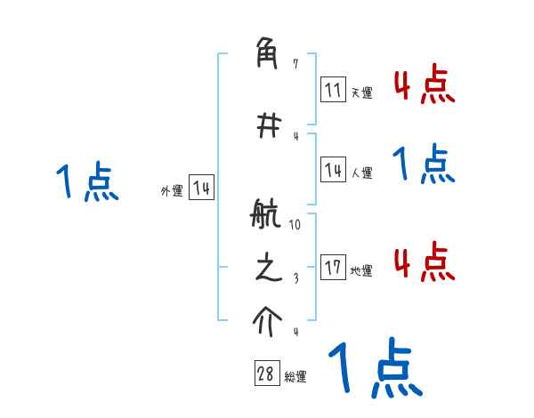 天運![]() | 角井航之介さんの天運は11画の4つ星!着実に富や地位を得る幸運な人生。 家系が持つ宿命的な運勢を表します。祖先から受け継いだ苗字ですので自分の力が及びません。家柄を象徴します。 |