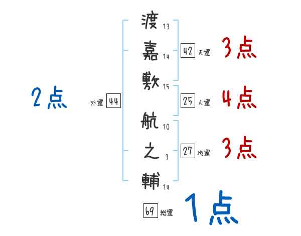 天運![]() | 渡嘉敷航之輔さんの天運は42画の3つ星!病気に注意。多芸であるが消極的でおとなしい。 家系が持つ宿命的な運勢を表します。祖先から受け継いだ苗字ですので自分の力が及びません。家柄を象徴します。 |