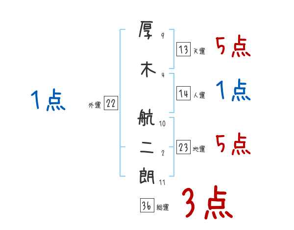 厚木航二朗さんの画数の鑑定結果