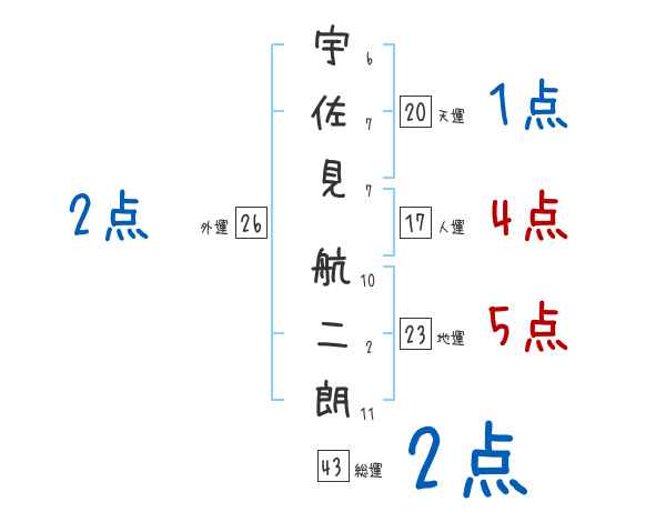 総運![]() | 宇佐見航二朗さんの総運は43画の2つ星!頑固な性格で独立心が強いかも。やや非現実的で浪費に注意しましょう。 あなたの人生を表す1番重要な運勢です。生涯を通じて影響する総合運となり、主に50歳以降の晩年期に影響を及ぼします。 |
