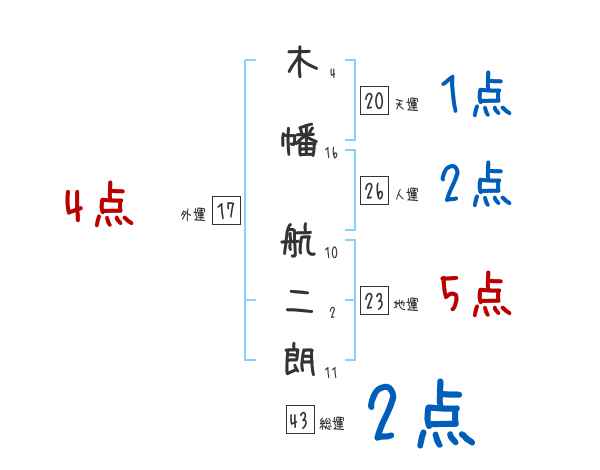 外運![]() | 木幡航二朗さんの外運は17画の4つ星!積極的な行動力。地位を気づき財産を手に入れる。純粋な心と直感力。 生活面を象徴する運勢です。外部から受ける影響力を表し、結婚運、家庭運や職場、環境への順応性を表します。 |