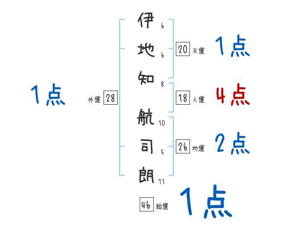 総運![]() | 伊地知航司朗さんの総運は46画の1つ星!迷走することが多く苦労するかも。目先のことにとらわれないように。 あなたの人生を表す1番重要な運勢です。生涯を通じて影響する総合運となり、主に50歳以降の晩年期に影響を及ぼします。 |