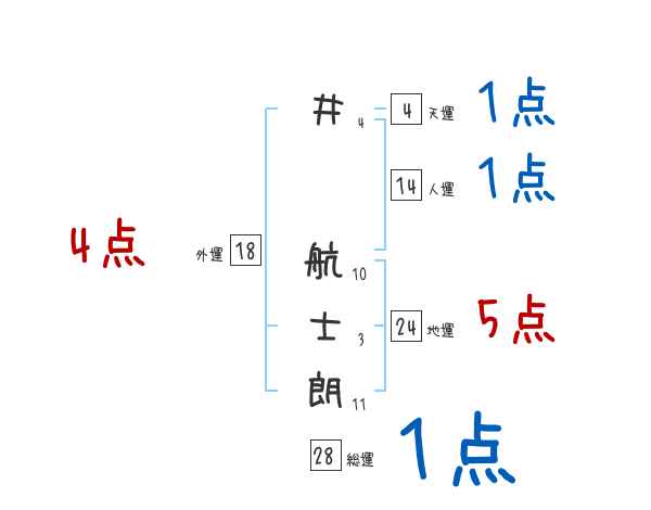 総運![]() | 井航士朗さんの総運は28画の1つ星!家庭環境に注意。スポーツで活躍できる能力があるかも。 あなたの人生を表す1番重要な運勢です。生涯を通じて影響する総合運となり、主に50歳以降の晩年期に影響を及ぼします。 |