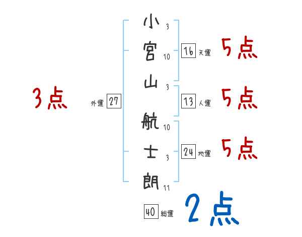 外運![]() | 小宮山航士朗さんの外運は27画の3つ星!頭脳明晰だが強情で摩擦が多い傾向。孤立に注意。 生活面を象徴する運勢です。外部から受ける影響力を表し、結婚運、家庭運や職場、環境への順応性を表します。 |