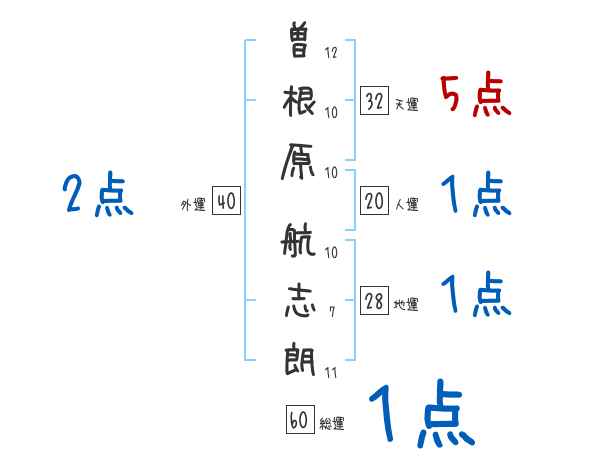 天運![]() | 曽根原航志朗さんの天運は32画の5つ星!柔軟性があり成功する。チャンスが多く金運が良い。 家系が持つ宿命的な運勢を表します。祖先から受け継いだ苗字ですので自分の力が及びません。家柄を象徴します。 |
