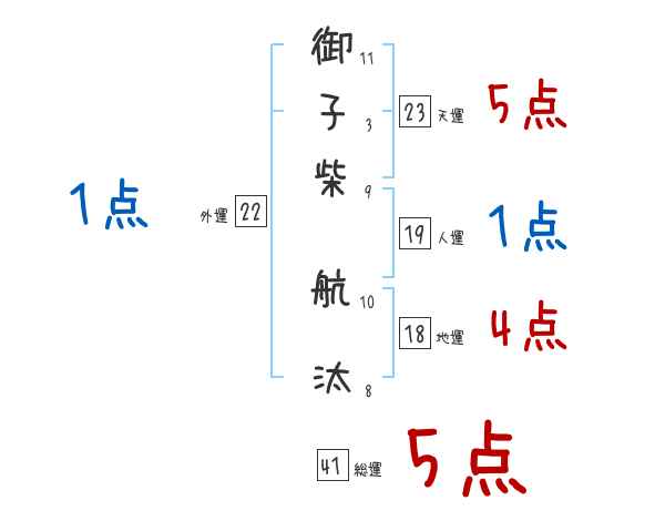 天運![]() | 御子柴航汰さんの天運は23画の5つ星!想像力に優れ活力がある。一代で成功し名誉を手に入れる。 家系が持つ宿命的な運勢を表します。祖先から受け継いだ苗字ですので自分の力が及びません。家柄を象徴します。 |