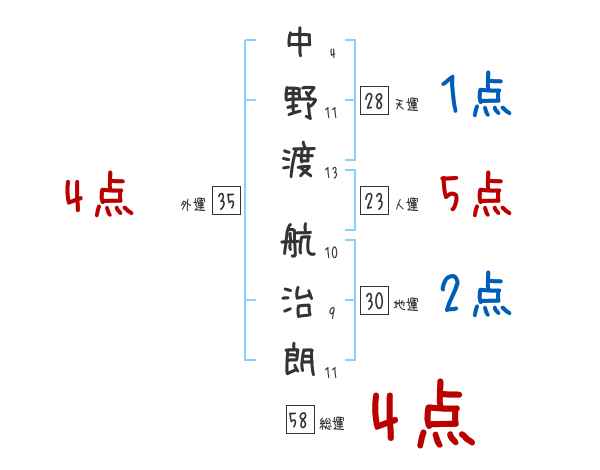 天運![]() | 中野渡航治朗さんの天運は28画の1つ星!家庭環境に注意。スポーツで活躍できる能力があるかも。 家系が持つ宿命的な運勢を表します。祖先から受け継いだ苗字ですので自分の力が及びません。家柄を象徴します。 |