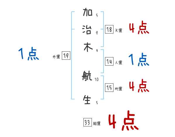 天運![]() | 加治木航生さんの天運は18画の4つ星!情熱的で剛気。忍耐力があり信頼される。 家系が持つ宿命的な運勢を表します。祖先から受け継いだ苗字ですので自分の力が及びません。家柄を象徴します。 |