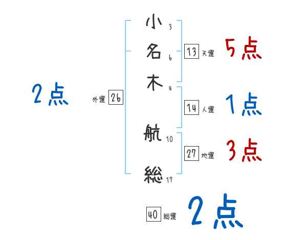 外運![]() | 小名木航総さんの外運は26画の2つ星!波瀾万丈かも。信頼できる人を大事にしましょう。 生活面を象徴する運勢です。外部から受ける影響力を表し、結婚運、家庭運や職場、環境への順応性を表します。 |