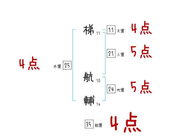 天運![]() | 梯航輔さんの天運は11画の4つ星!着実に富や地位を得る幸運な人生。 家系が持つ宿命的な運勢を表します。祖先から受け継いだ苗字ですので自分の力が及びません。家柄を象徴します。 |