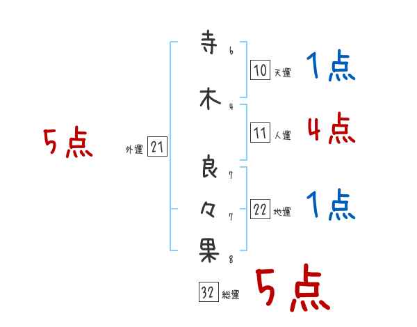 総運![]() | 寺木良々果さんの総運は32画の5つ星!柔軟性があり成功する。チャンスが多く金運が良い。 あなたの人生を表す1番重要な運勢です。生涯を通じて影響する総合運となり、主に50歳以降の晩年期に影響を及ぼします。 |