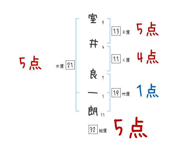 総運![]() | 室井良一朗さんの総運は32画の5つ星!柔軟性があり成功する。チャンスが多く金運が良い。 あなたの人生を表す1番重要な運勢です。生涯を通じて影響する総合運となり、主に50歳以降の晩年期に影響を及ぼします。 |