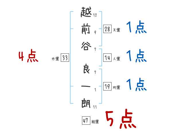 天運![]() | 越前谷良一朗さんの天運は28画の1つ星!家庭環境に注意。スポーツで活躍できる能力があるかも。 家系が持つ宿命的な運勢を表します。祖先から受け継いだ苗字ですので自分の力が及びません。家柄を象徴します。 |
